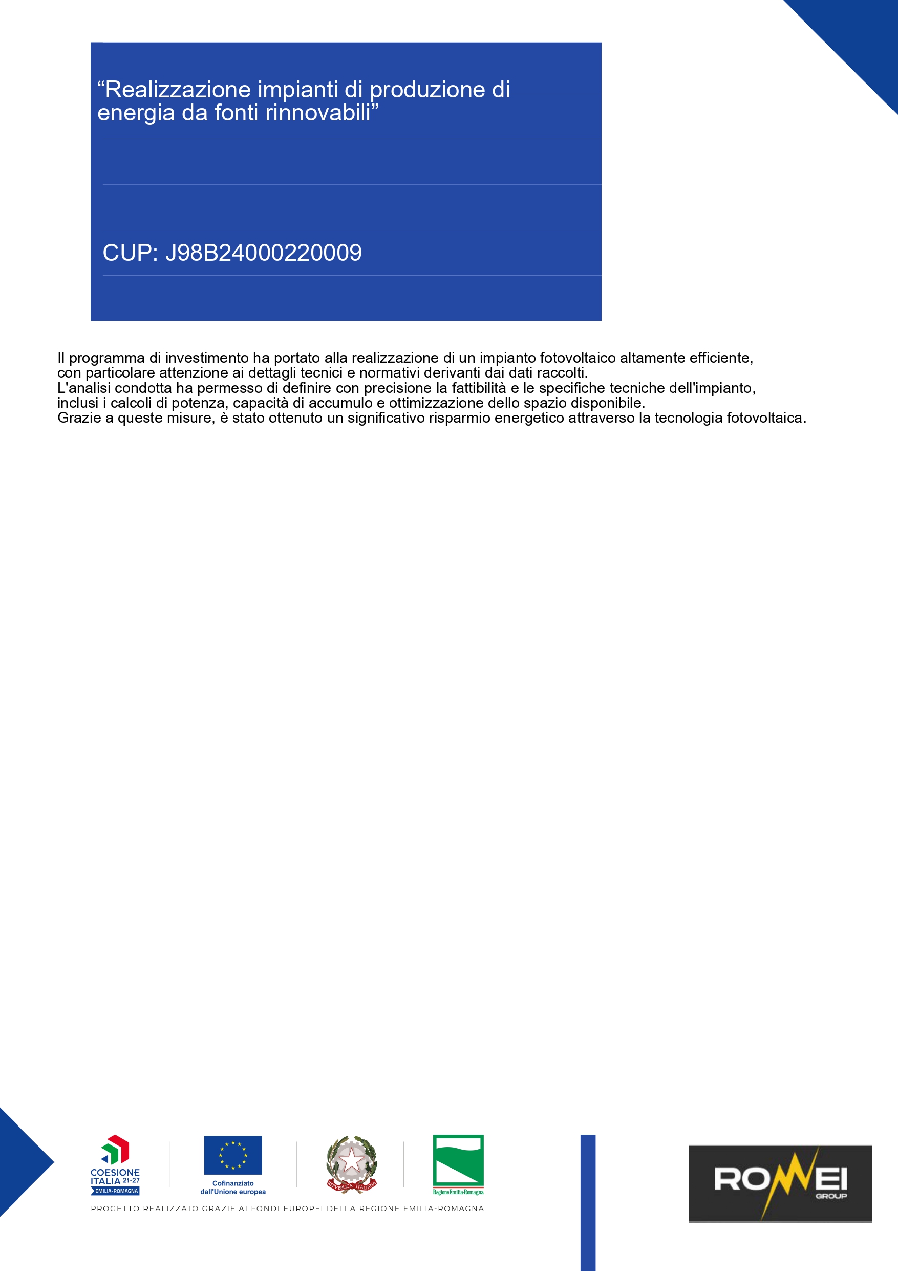 Grazie a queste misure, è stato ottenuto un significativo risparmio energetico attraverso la tecnologia fotovoltaica.